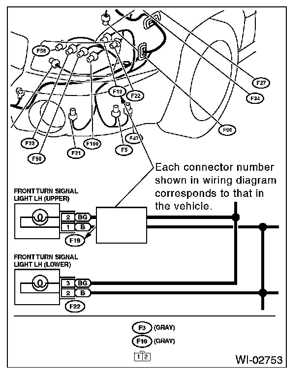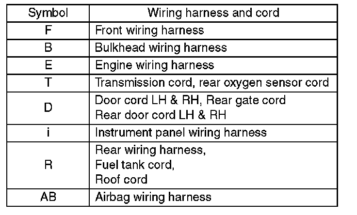 - Each connector number shown in the wiring diagram corresponds to that in the wiring harness. The location of each connector in the actual vehicle is determined by reading the first character of the connector (for example, a "F" for F8, "i" for i16, etc.) and the type of wiring harness. The first character of each connector number corresponds to the area or system of the vehicle.
