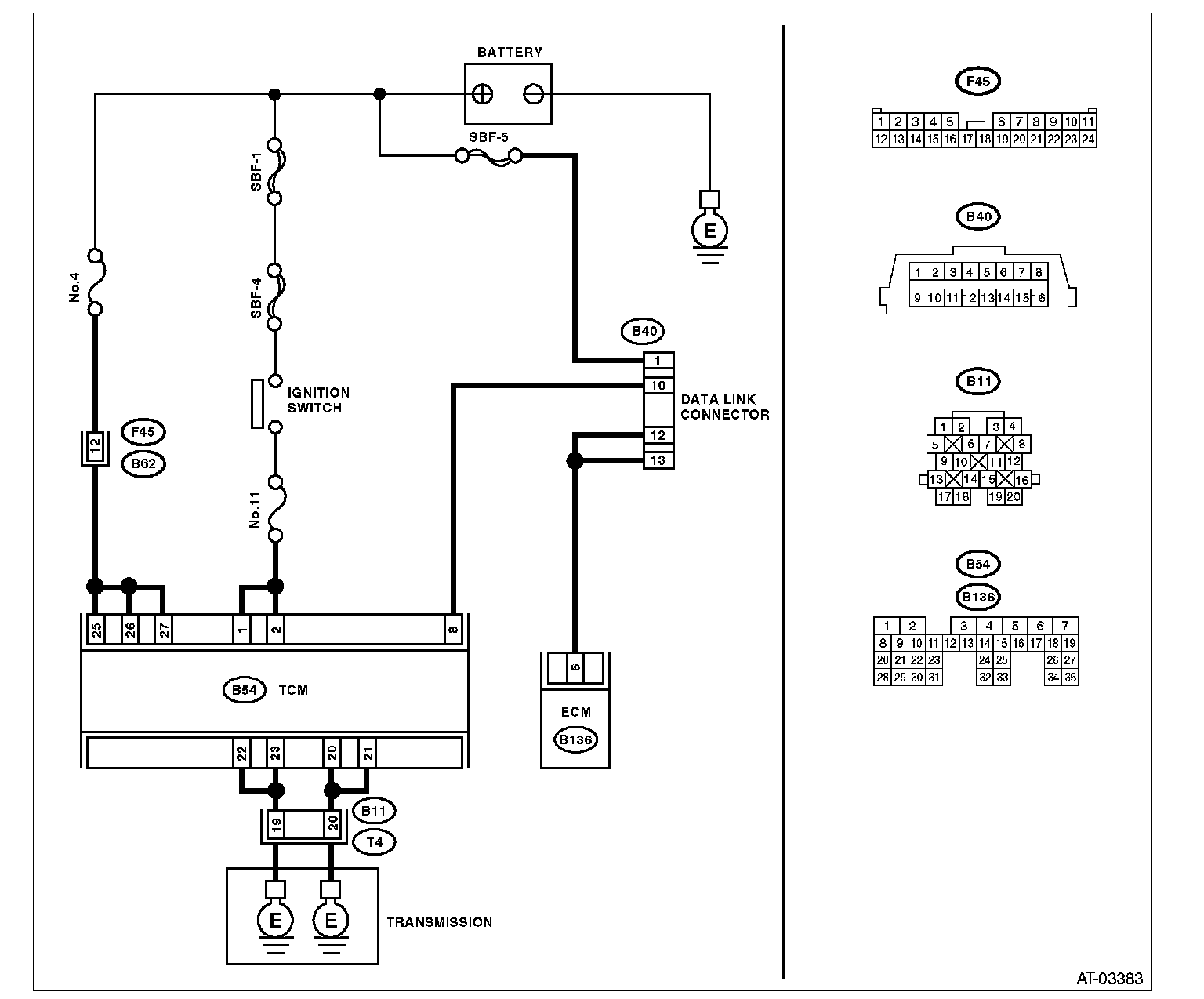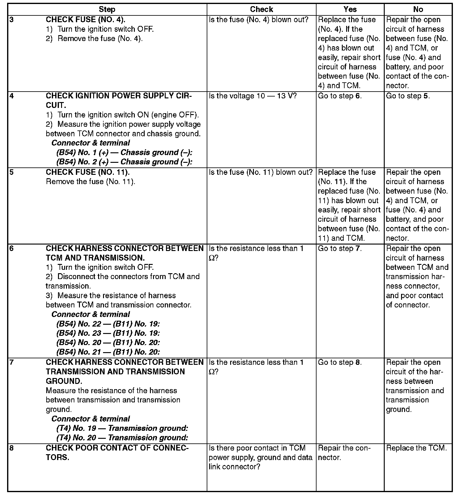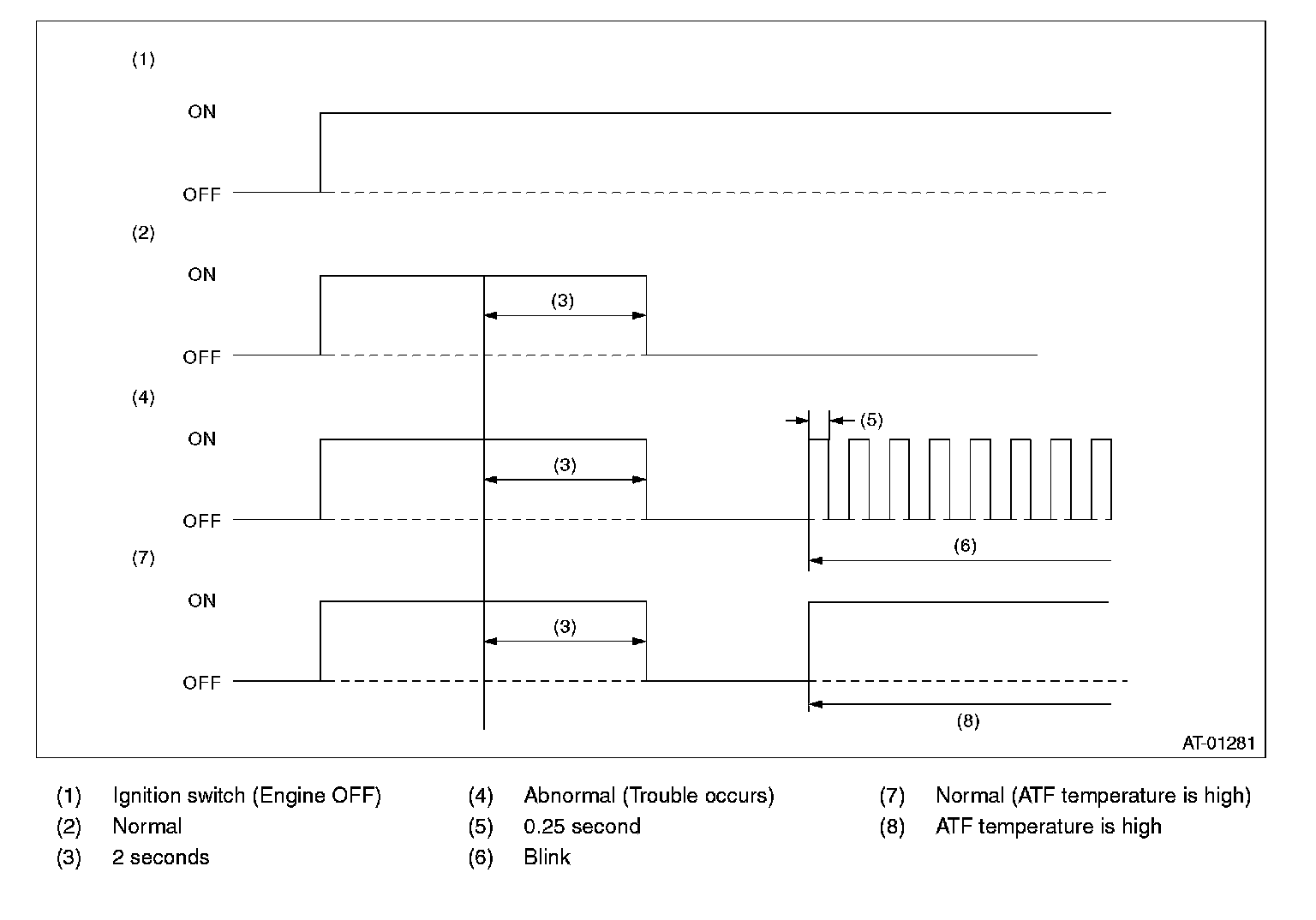 When any on-board diagnostics item is malfunctioning, AT OIL TEMP warning light blinks from the time malfunction is detected after starting the engine until ignition switch is turned to OFF. The malfunctioning part or unit can be determined by a DTC during the on-board diagnostics operation. Problems which occurred previously can also be identified through the memory function. If the AT OIL TEMP warning light does not show a problem (although a problem is occurring), the problem can be determined by checking the performance characteristics of each sensor using Subaru Select Monitor. Indicator light signal patterns are as shown in the figure.