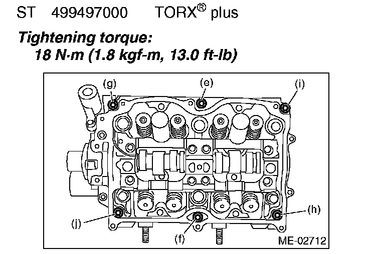 Tighten the TORX bolts (e) through (j) in alphabetical sequence using ST. ST 499497000 TORX plus