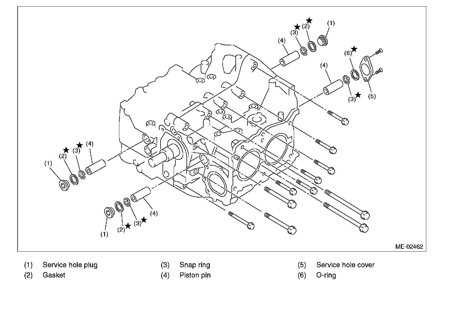 26. Rotate the crankshaft to bring #1 and #2 pistons to bottom dead center position, then remove the piston snap ring through service hole of #1 and #2 cylinders.