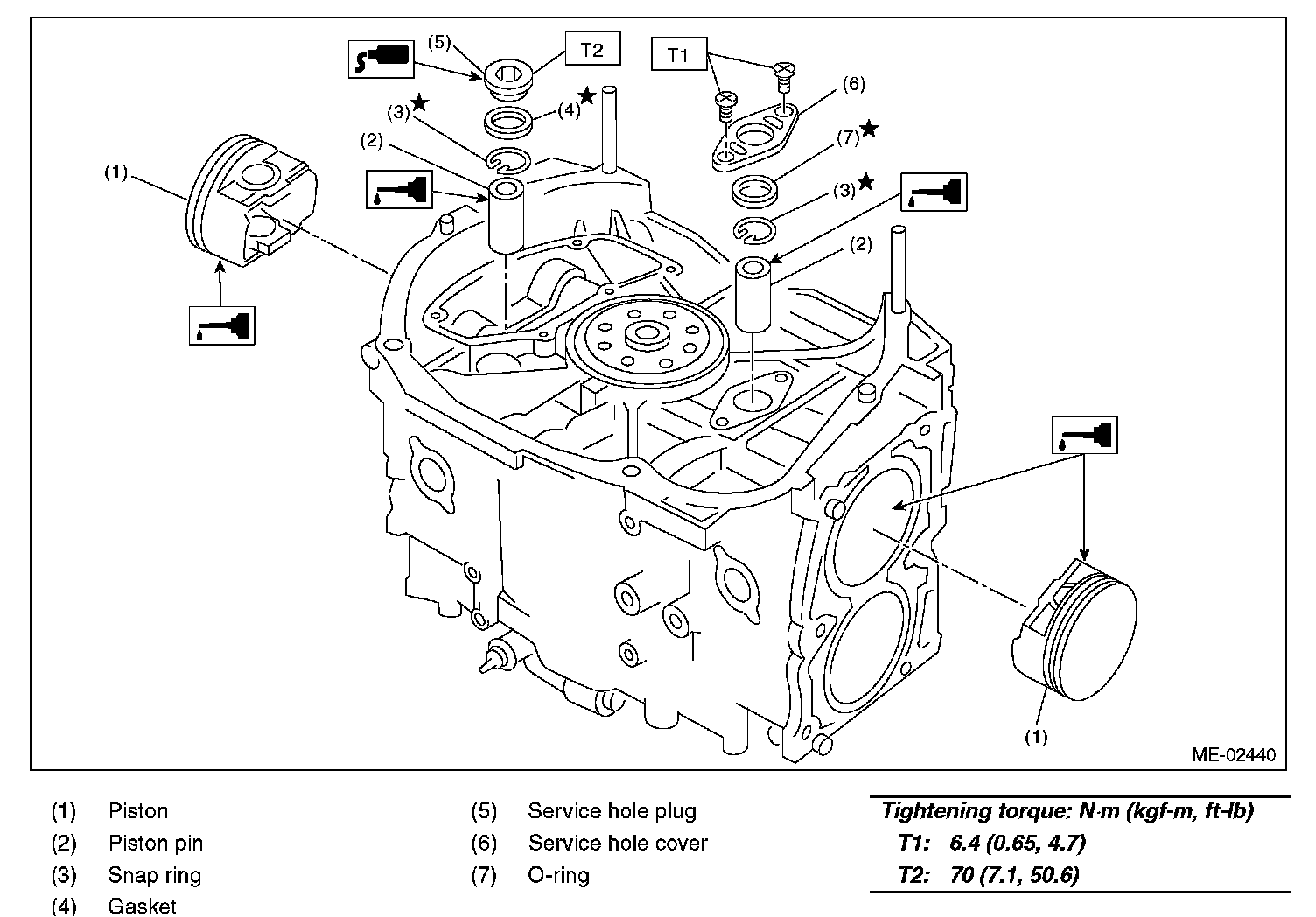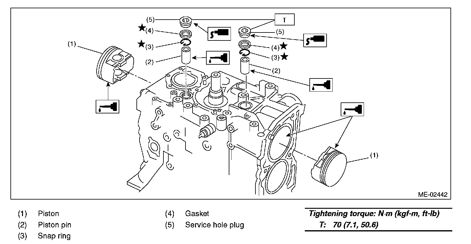 2 Apply a coat of engine oil to piston pin, and insert the piston pin into piston and connecting rod through service hole.