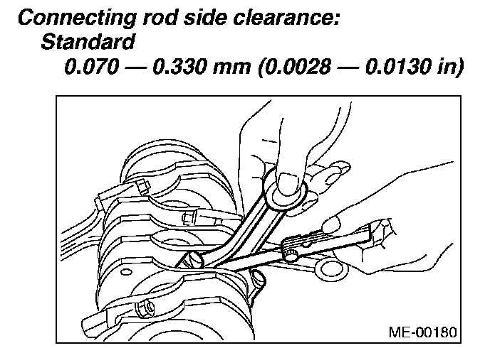 3. Install the connecting rod fitted with bearing to crankshaft and measure the side clearance (thrust clearance). If side clearance exceeds the limit or has partial wear, replace the connecting rod.