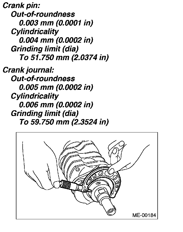 3. Inspect the crank journal and crank pin for wear. If they are not within the specifications, replace the bearing with a suitable (undersize) one, and replace or recondition crankshaft as necessary. When grinding the crank journal or crank pin, finish them to the specified dimensions according to the undersize bearing to be used.