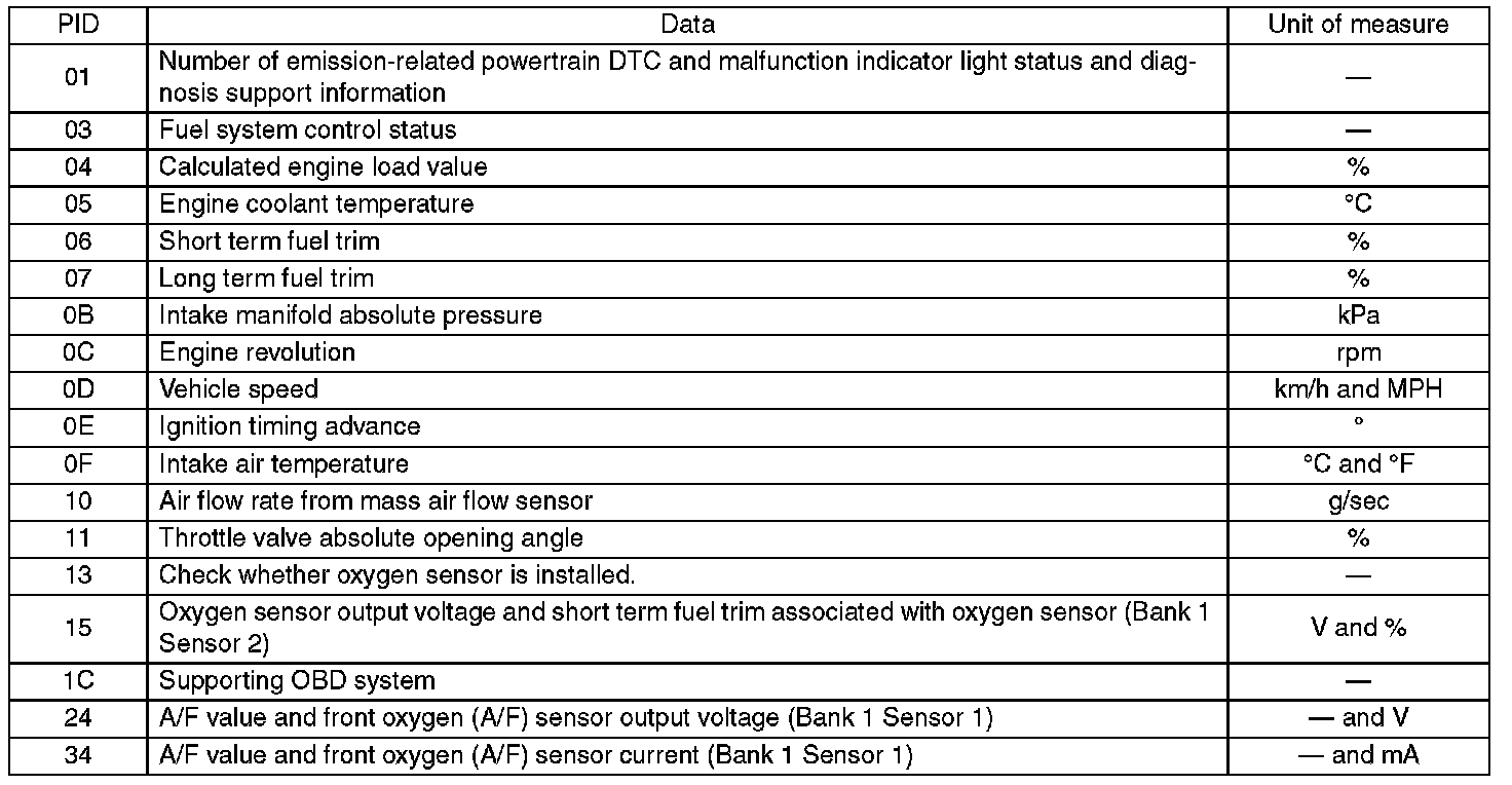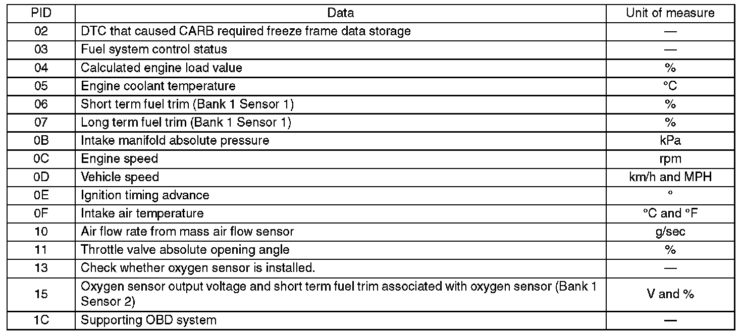A list of the support data and PID (Parameter Identification) codes are shown in the table.