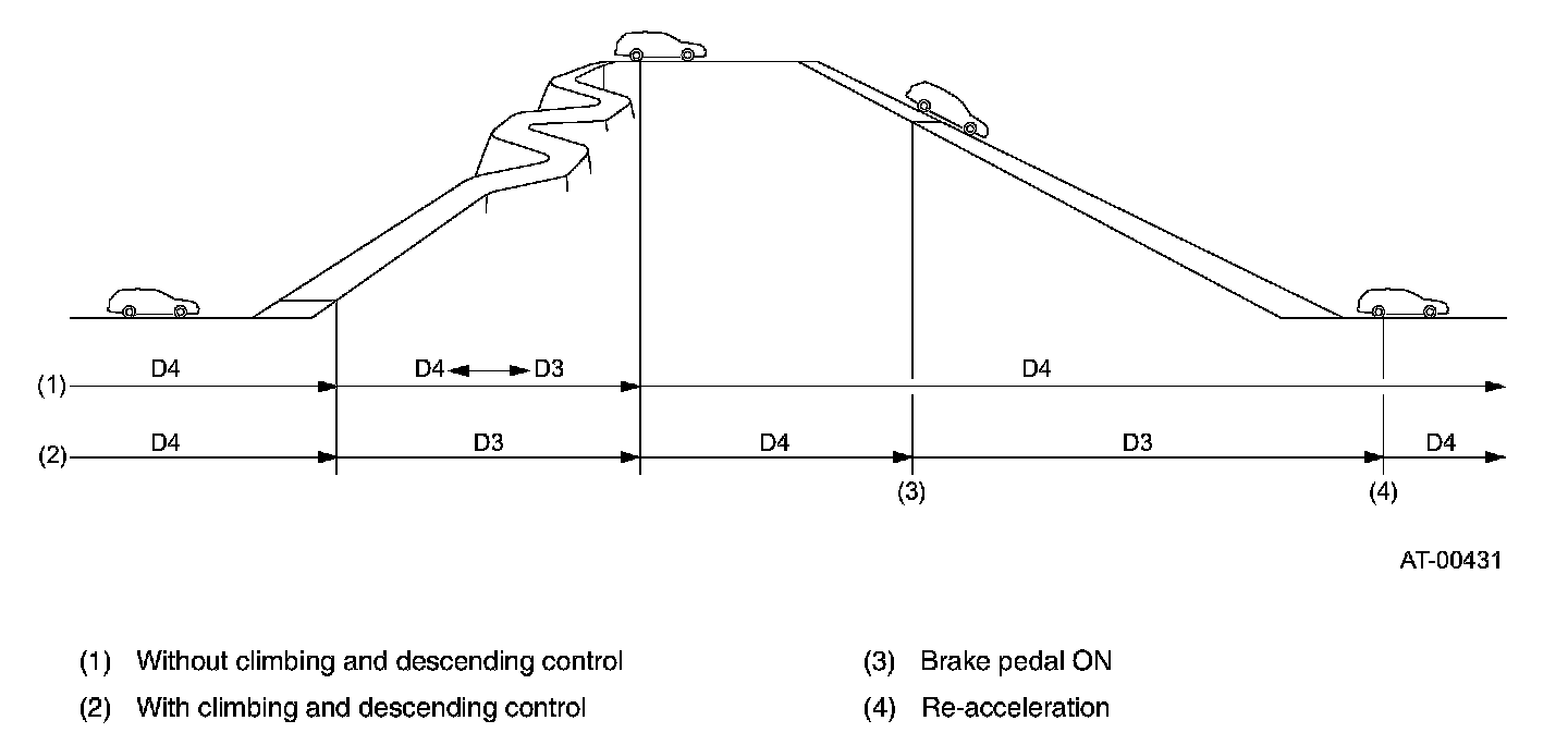 When the ATF temperature is low as in cases such as immediately after start in winter, upshifting to 4th is inhibited to quicken warm up. Upshifting to 4th is also inhibited if the ATF temperature becomes extremely high after severe driving, to prevent further temperature rise.