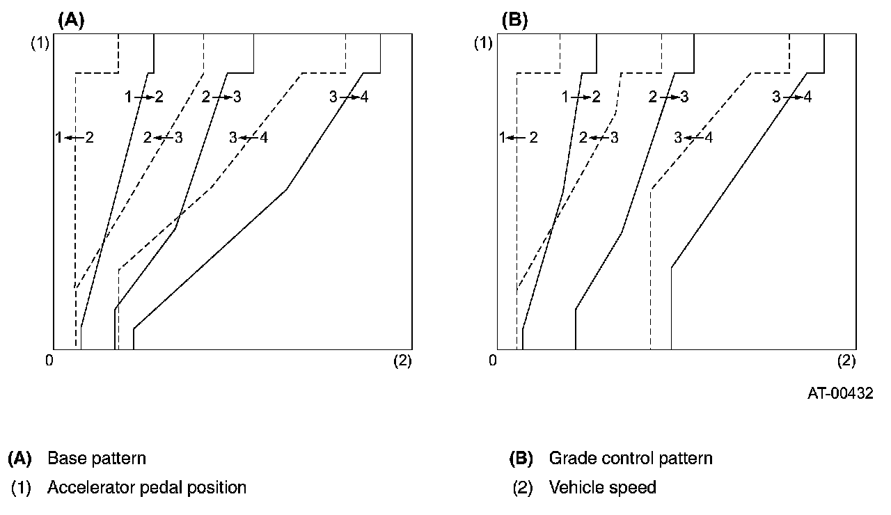 When the accelerator pedal is quickly depressed, the TCM interprets this as acceleration is required, and the transmission is downshifted earlier to obtain a greater drive force.