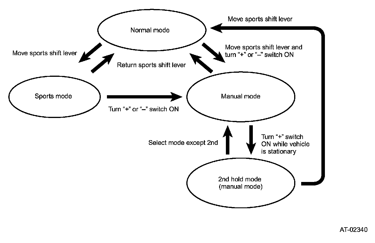 The gear upshifts each time the "+" switch is operated, however, when the vehicle speed is too low for the selected gear speed, the TCM inhibits further upshifting. If the vehicle speed becomes too slow for the current gear speed, a downshift will be made automatically to prevent engine stall. When the vehicle comes to a stop, the transmission will always be controlled to shift to 1st speed unless the vehicle was in Manual mode 2nd hold control.