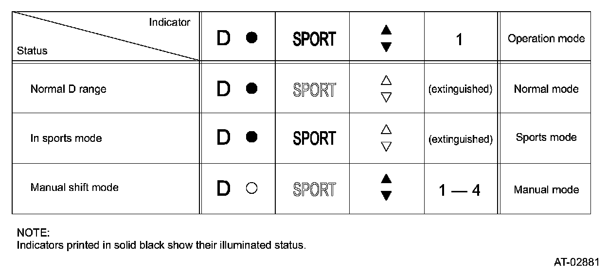 Illuminations of the various indicators on the combination meter are controlled in accordance with the shift pattern selection as shown in the table.