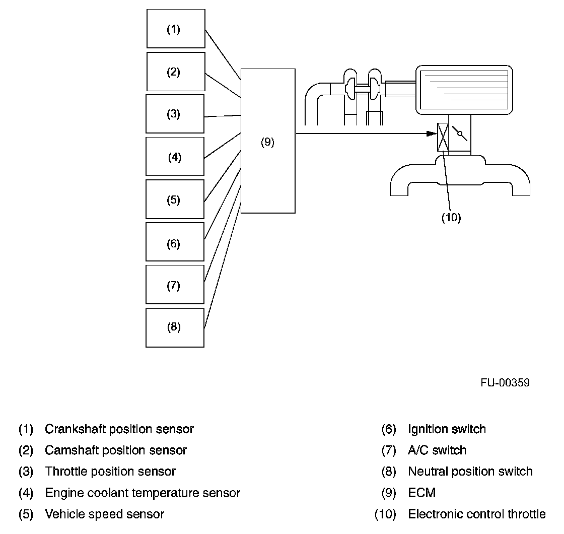 IDLE AIR CONTROL- The ECM controls the electronic control throttle based on signals from the crankshaft position sensor, engine coolant temperature sensor, air flow sensor, manifold absolute pressure sensor and A/C switch so that the proper idle speed for each engine load is achieved.