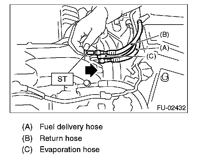 1. Disconnect the quick connector of fuel delivery line and return line by pushing the ST in the direction of arrow.