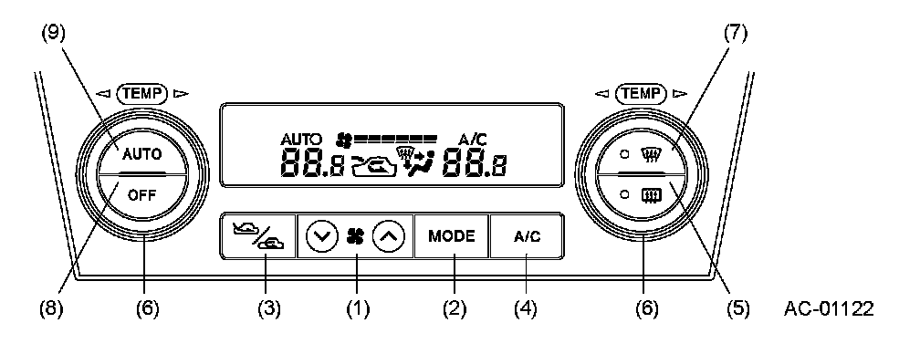 When this switch is turned ON the system enters auto air conditioning mode and automatically controls the blower fan speed, air outlet, fresh/recirculation switching, and compressor operation.
