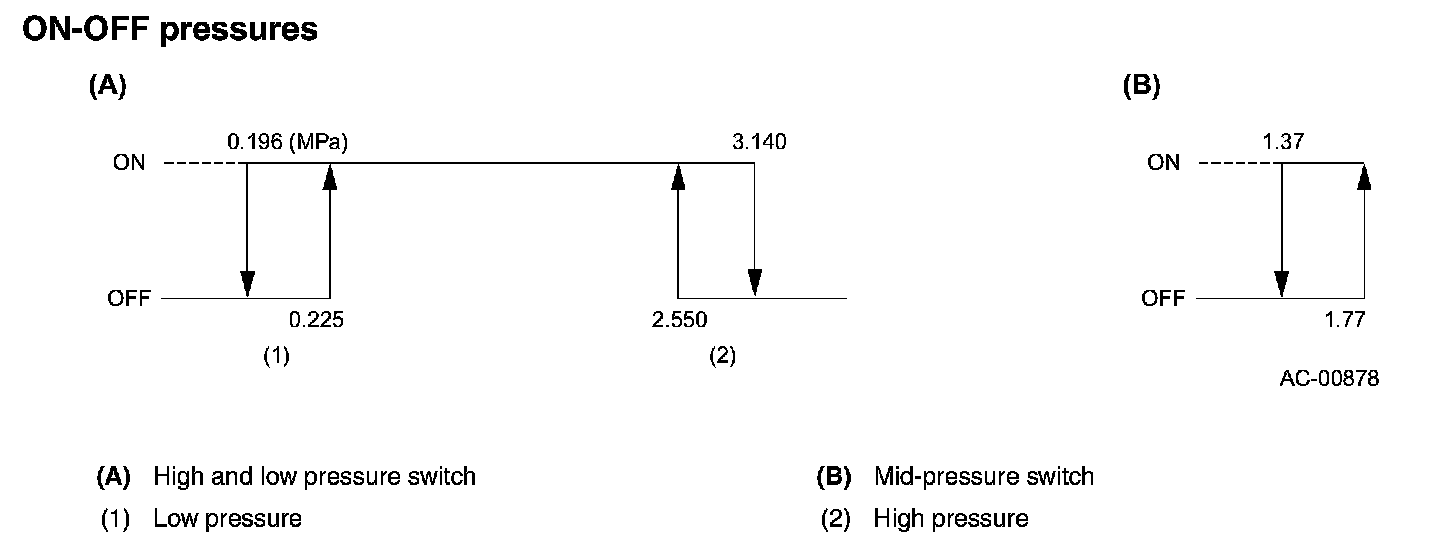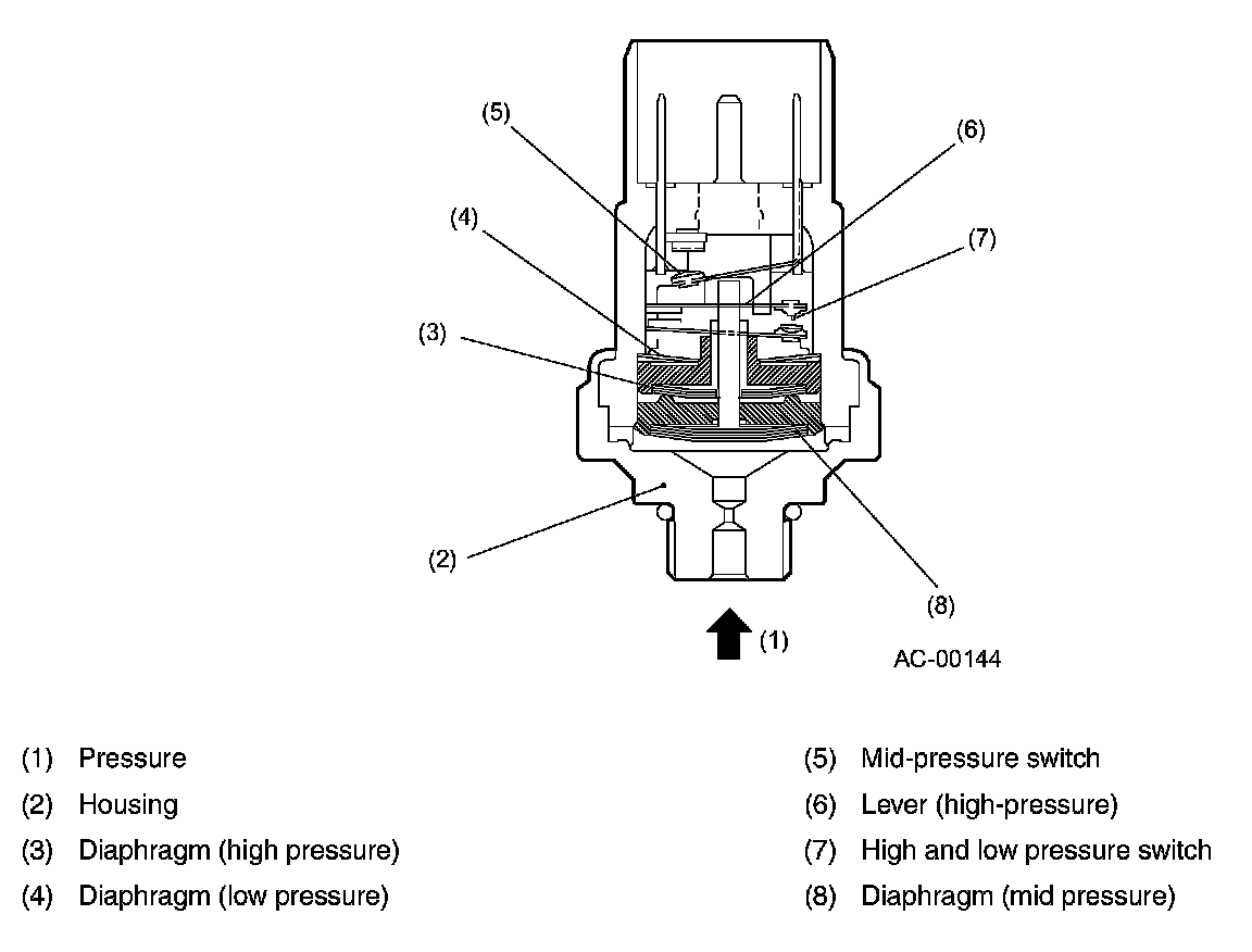 PRESSURE SWITCHThe pressure switch is a high-pressure side component of the refrigeration cycle (cooling cycle). It consists of a diaphragm that receives refrigerant gas pressure, a snap plate, a rod, contacts that open both when the gas pressure is too low and when it is too high, and a switch that operates at mid-pressure.
