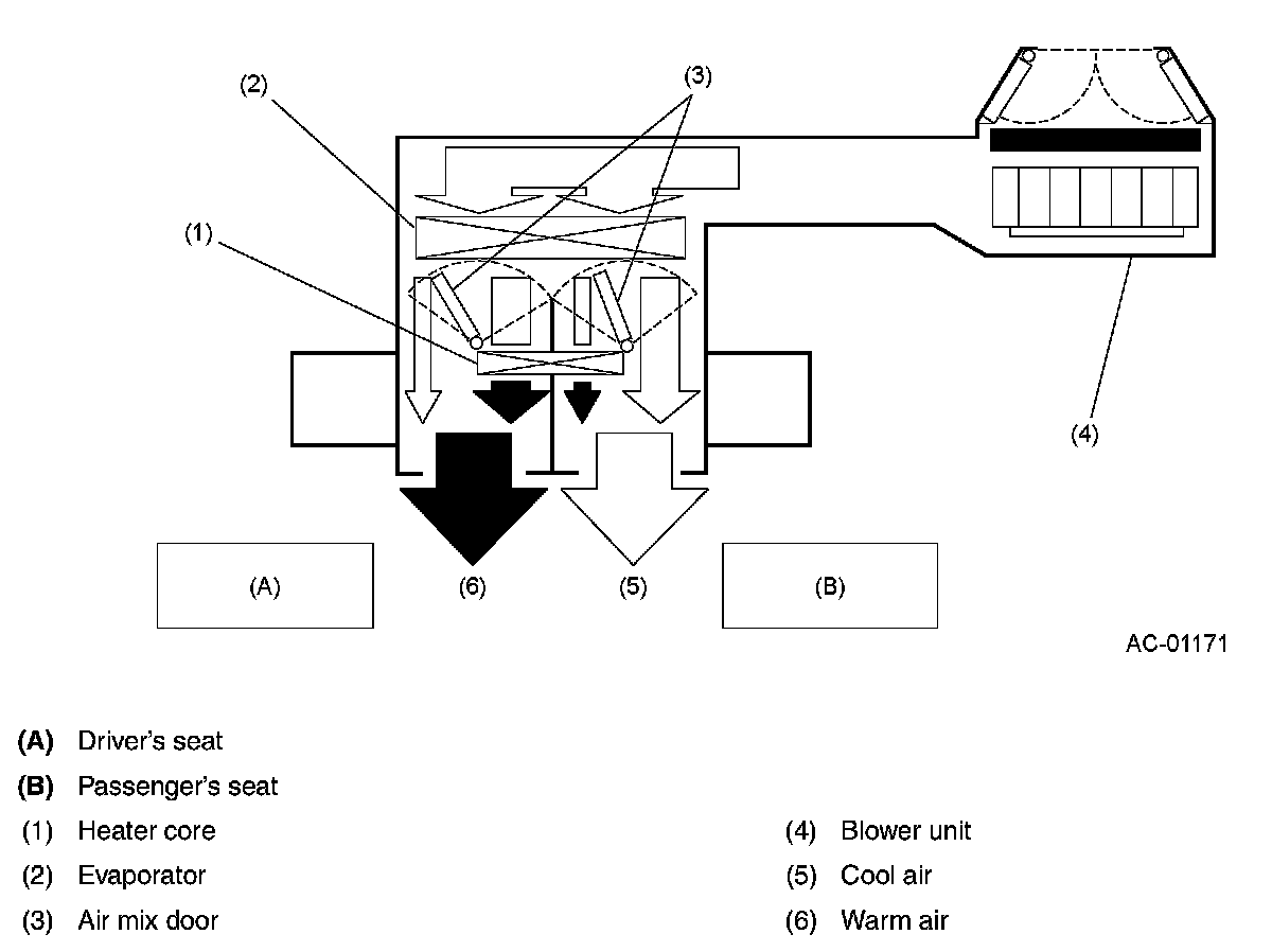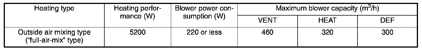- A semi-center type integrated air conditioning unit is used, where a high performance heater core and an evaporator core are placed in front and rear of the unit. While ensuring sufficient leg space at the front passenger's seat, resistance to air flow in the air passage is reduced, and the air conditioning system offers a low noise and comfortable environment in all seasons through its functions such as heating, air conditioning, ventilating and defrosting.