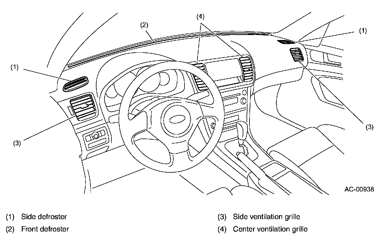 - There are four ventilation grilles in the dashboard; two large size grilles at the center and a side grille at each side. To improve the defrosting performance, air is always sent out from the side grilles.