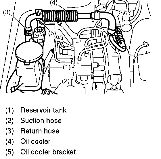 8. Disconnect the suction hose and return hose from reservoir tank. Remove the oil cooler from oil cooler bracket.