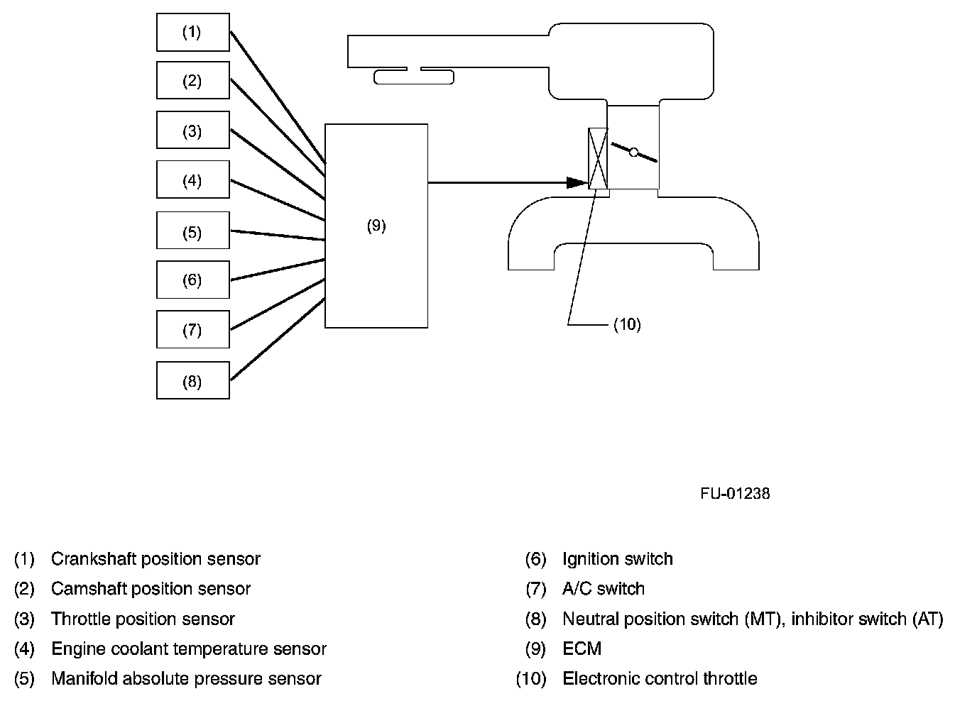 IDLE AIR CONTROL- The ECM controls the electronic control throttle based on signals from the crankshaft position sensor, engine coolant temperature sensor, manifold absolute pressure sensor and A/C switch so that the proper idle speed for each engine load is achieved.