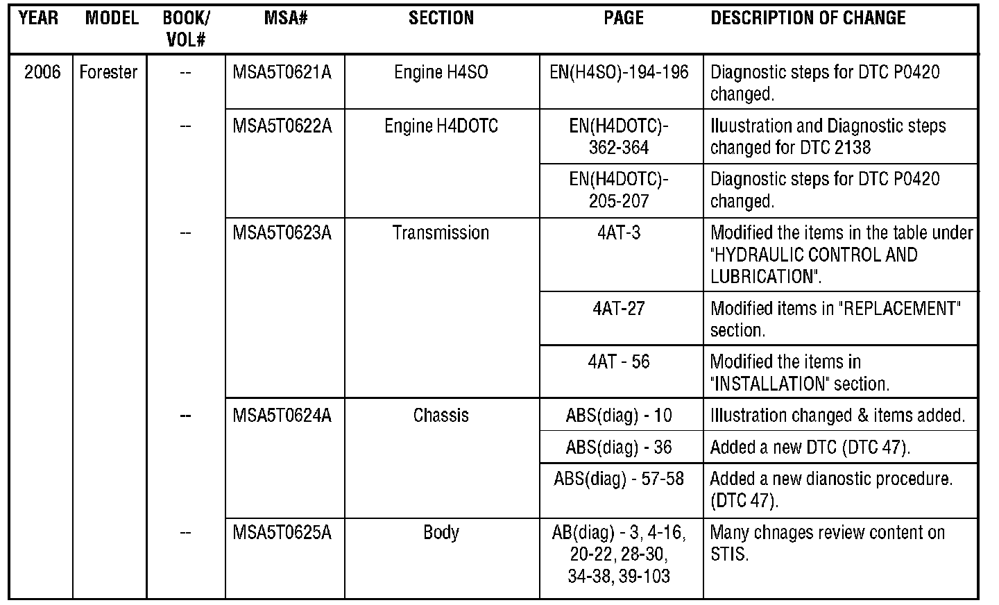 The purpose of this bulletin is to provide a description of current changes to Service Manuals available via the Subaru Technical Information System (STIS) web site. The tables shown are to be used as guides for becoming aware of the latest changes. We advise you to always refer to the STIS web site when looking for the latest Service information. Printed pages will not be made available to update printed Service Manuals.