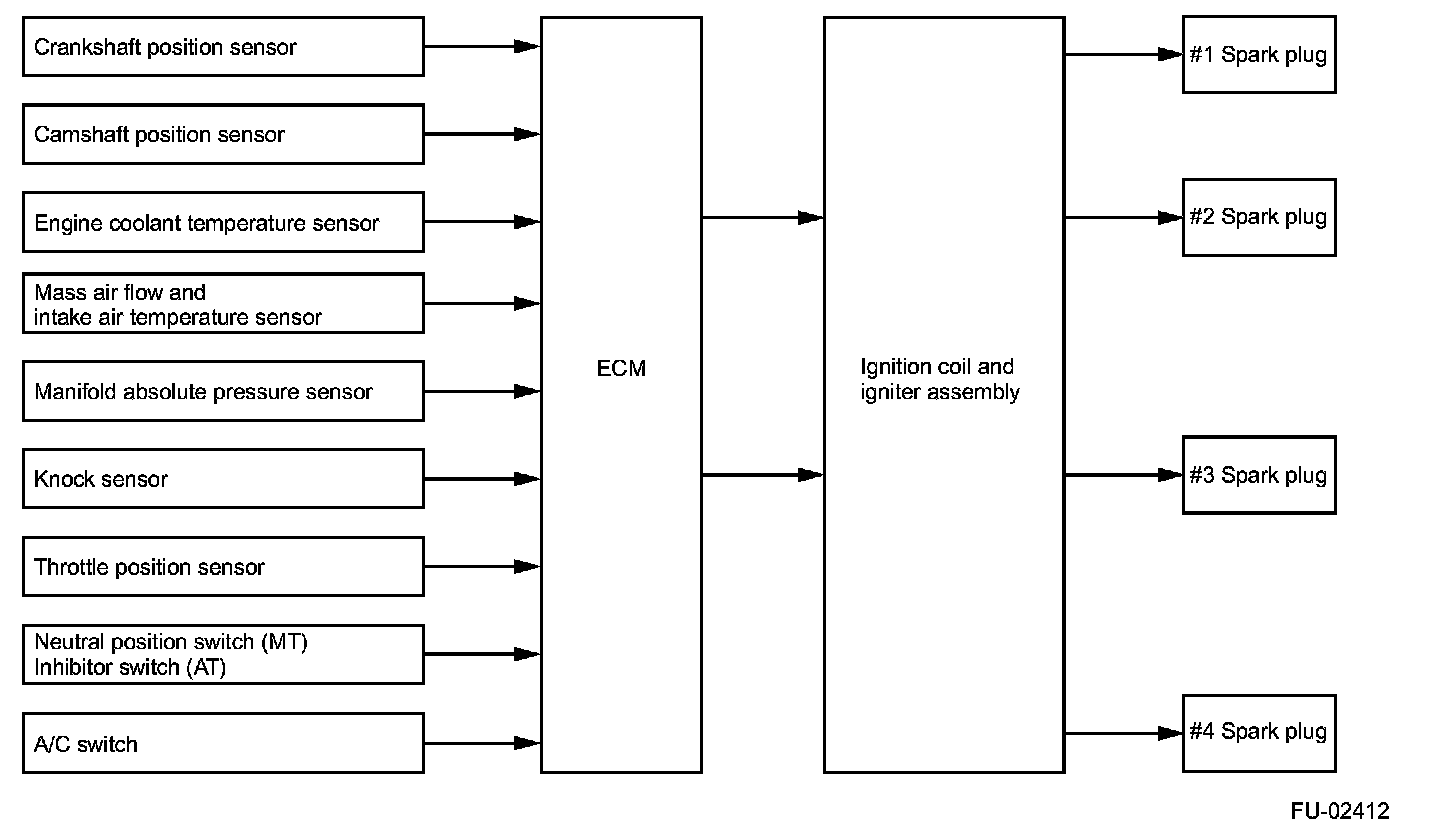 IGNITION CONTROL- The ECM determines operating condition of the engine based on signals from the manifold absolute pressure sensor, engine coolant temperature sensor, intake air temperature sensor, crankshaft position sensor and other sources. The ECM then selects the ignition timing most appropriate for the condition thus determined from those stored in its memory and outputs at that timing a primary current OFF signal to the igniter to initiate ignition.