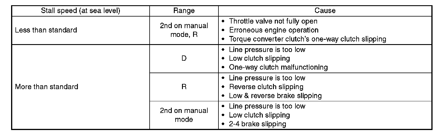 ^ If the stall speed is higher than the specified range, attempt to finish the stall test in as short a time as possible, in order to prevent the automatic transmission from sustaining damage.