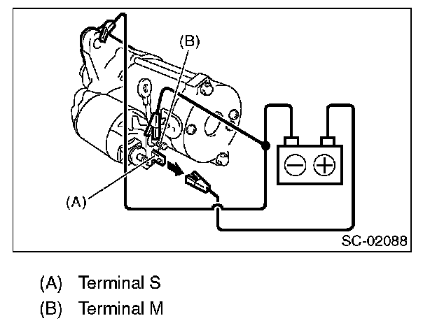 Connect the positive terminal to terminal S and the negative terminal to terminal M and starter body to pull the pinion gear at the main contact point. Make sure the pinion gear returns to its original position when the terminal S is disconnected.