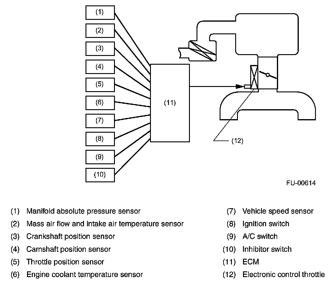 IDLE AIR CONTROL- The ECM controls the electronic control throttle based on signals from the crankshaft position sensor, engine coolant temperature sensor, air flow and intake air temperature sensor, and A/C switch etc. so that the proper idle speed for each engine load is achieved.