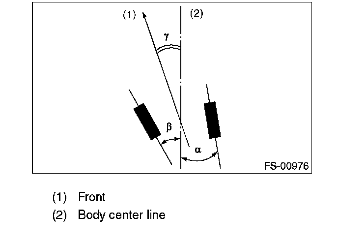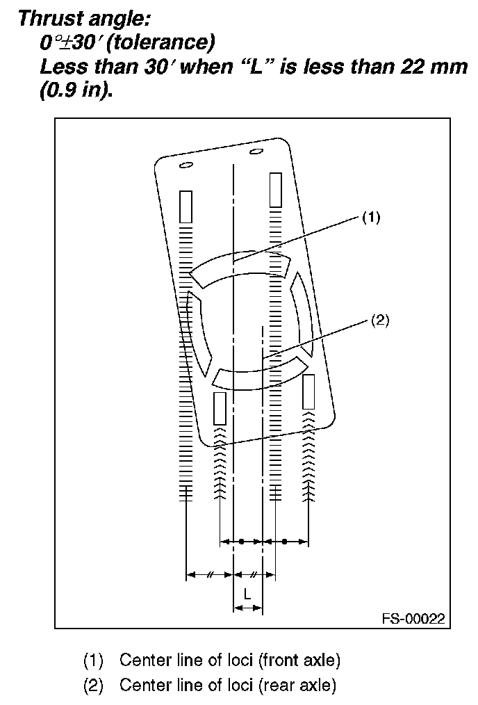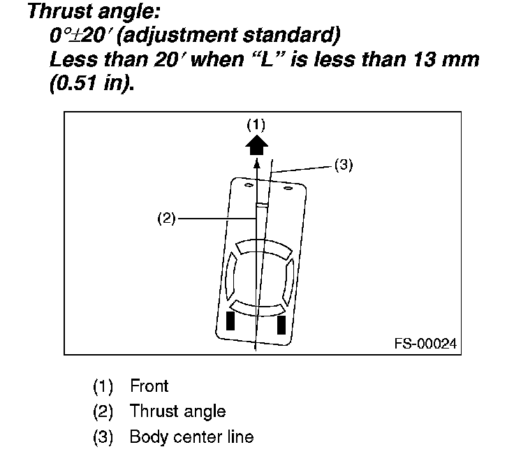 Thrust angle refers to a mean value of right and left rear wheel toe angles in relation to the vehicle body center line. Vehicle is driven straight in the thrust angle direction while swinging in the oblique direction depending on the degree of the mean thrust angle.