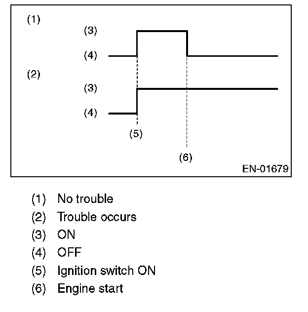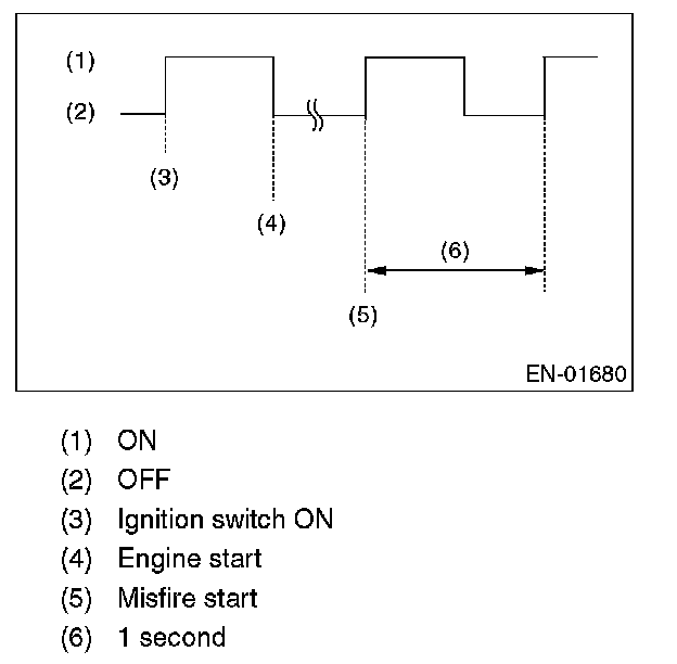 4. When the ignition switch is turned to ON (engine off) or to "START" with test mode connector connected, the malfunction indicator light blinks at a cycle of 3 Hz.