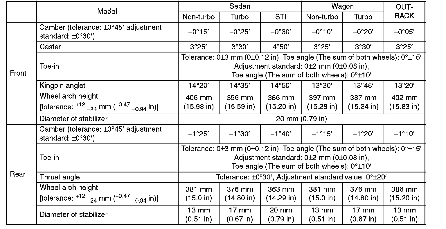 ^ The other items indicated in the specification table cannot be adjusted. If the other items exceed specifications, check suspension parts and connections for deformities; replace with new ones as required.