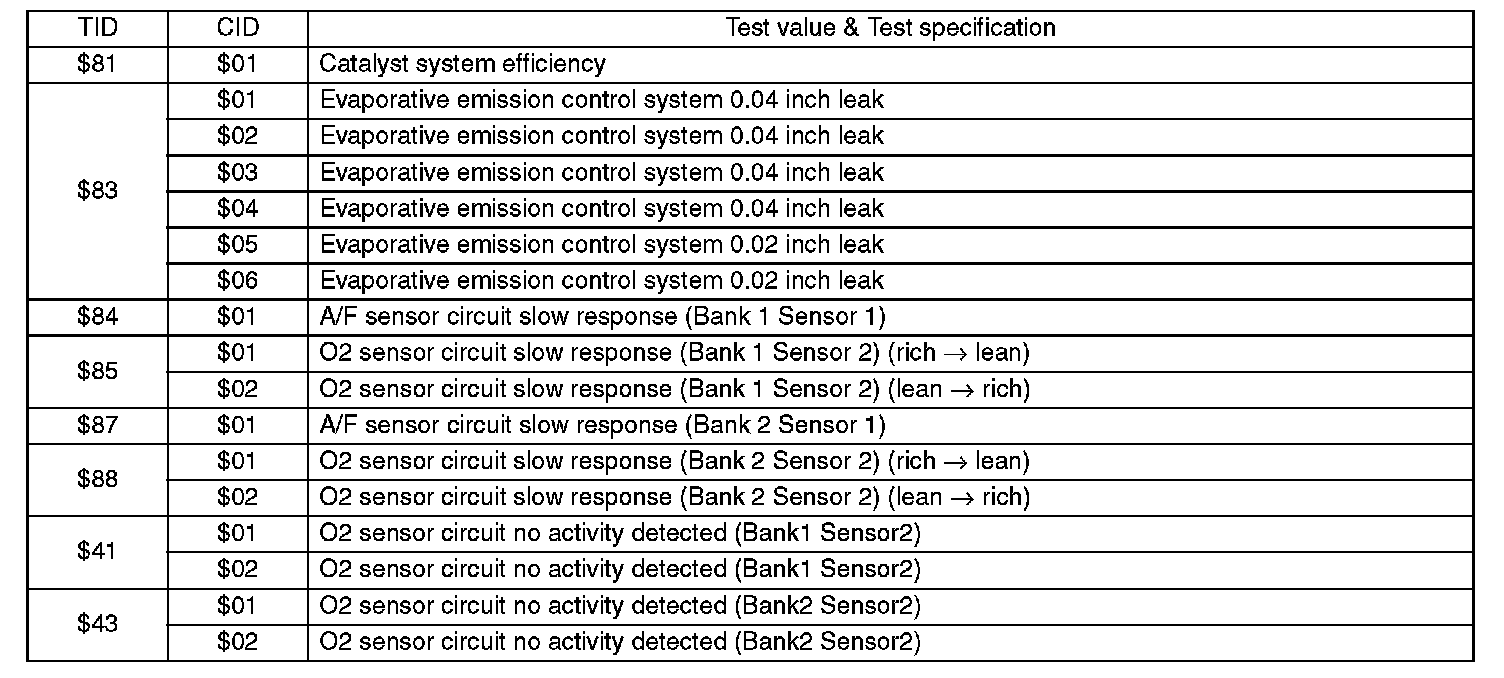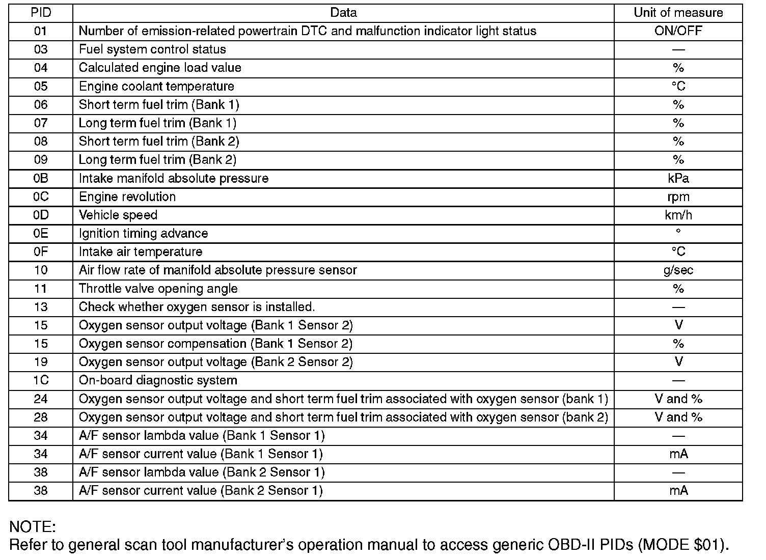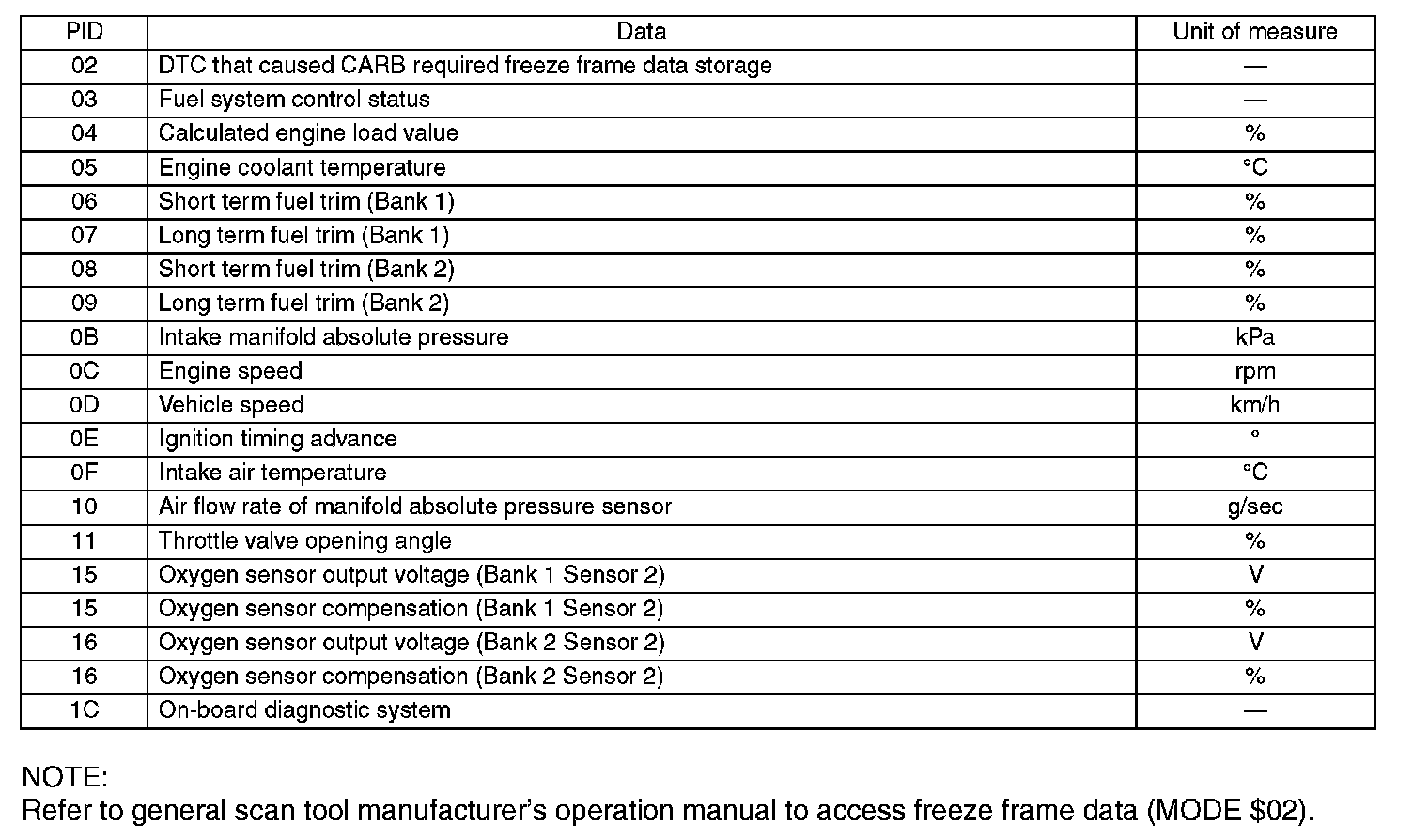 Refer to data denoting the operating condition when trouble is detected by on-board diagnosis system. A list of the support data and PID (Parameter Identification) codes are shown in the given table.
