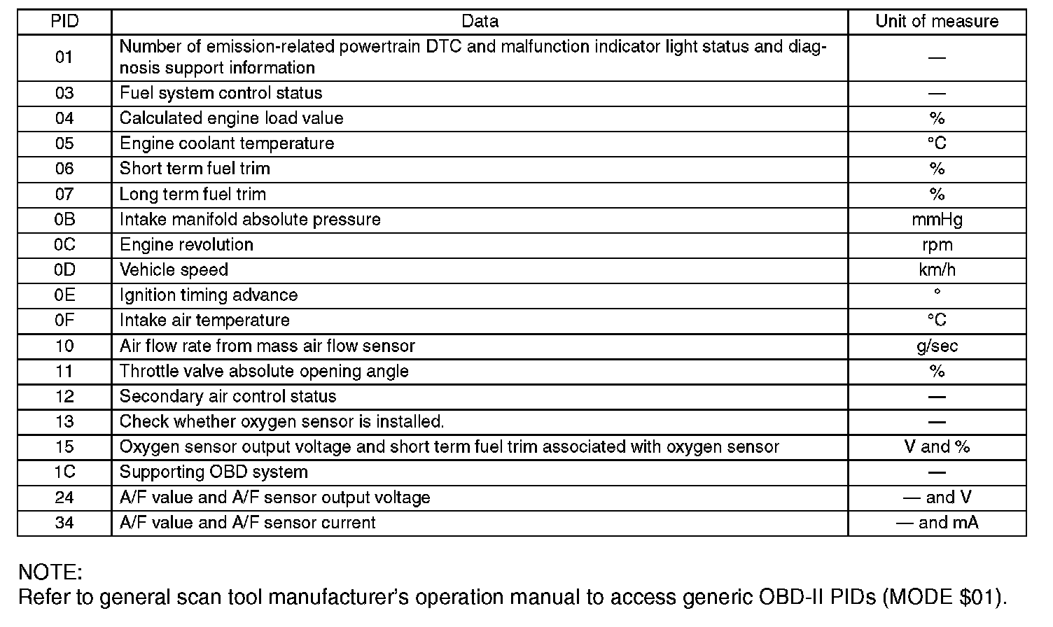 A list of the support data and PID (Parameter Identification) codes are shown in the table.