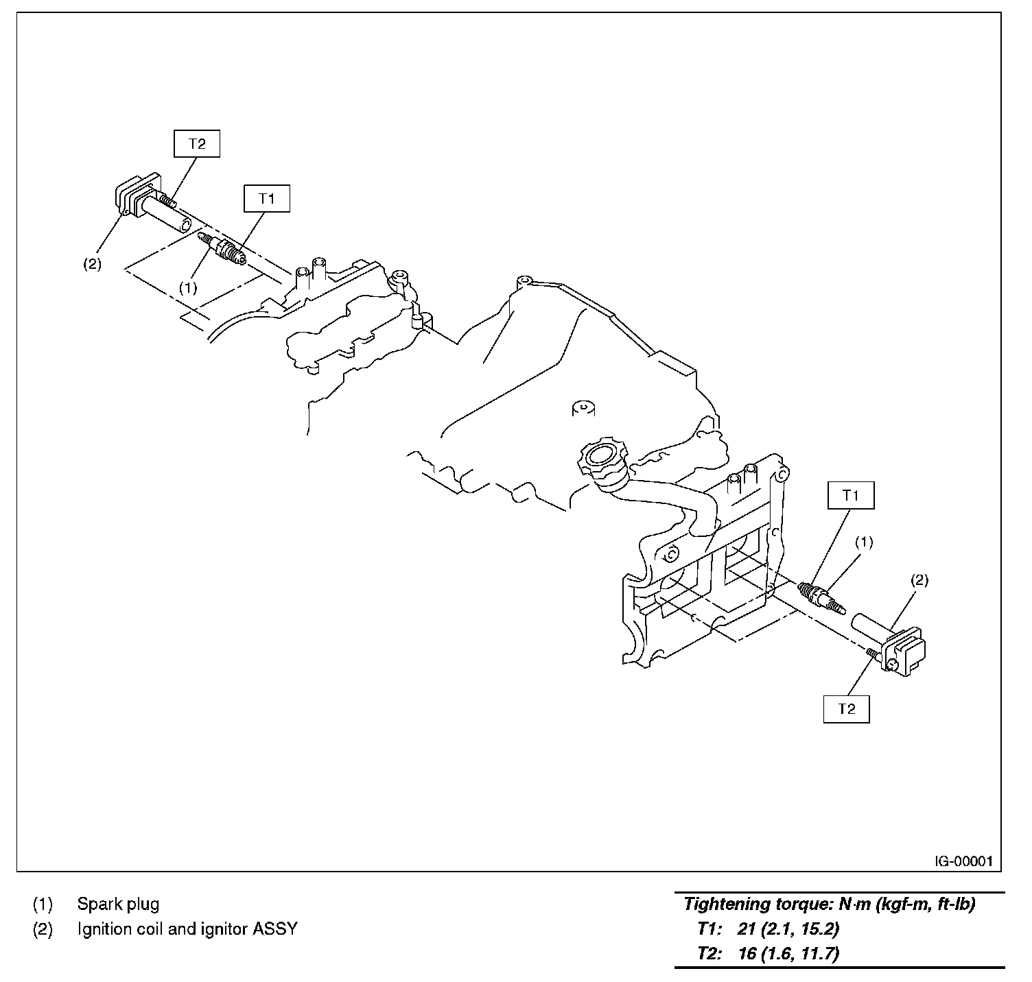 Tightening torque (Ignition coil and ignitor assembly): 16 N.m (1.6 kgf-m, 11.7 ft-lb)