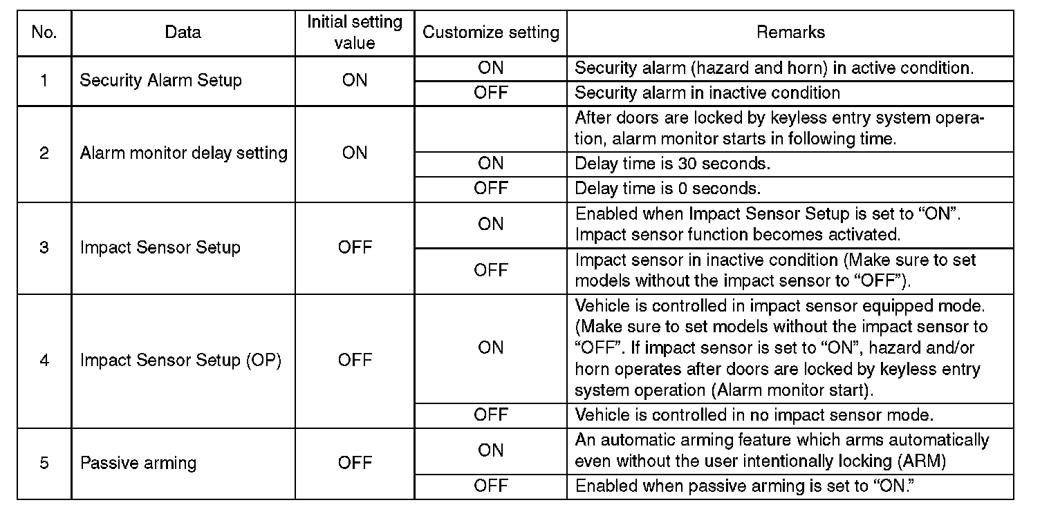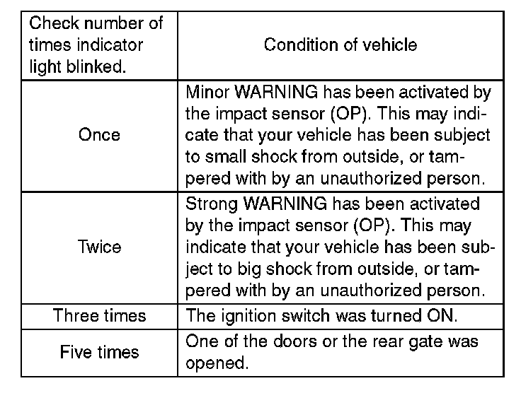 - If ALARM/WARNING occurs during the armed mode, the indicator light will flash at ignition OFF . ON at the next DISARM.