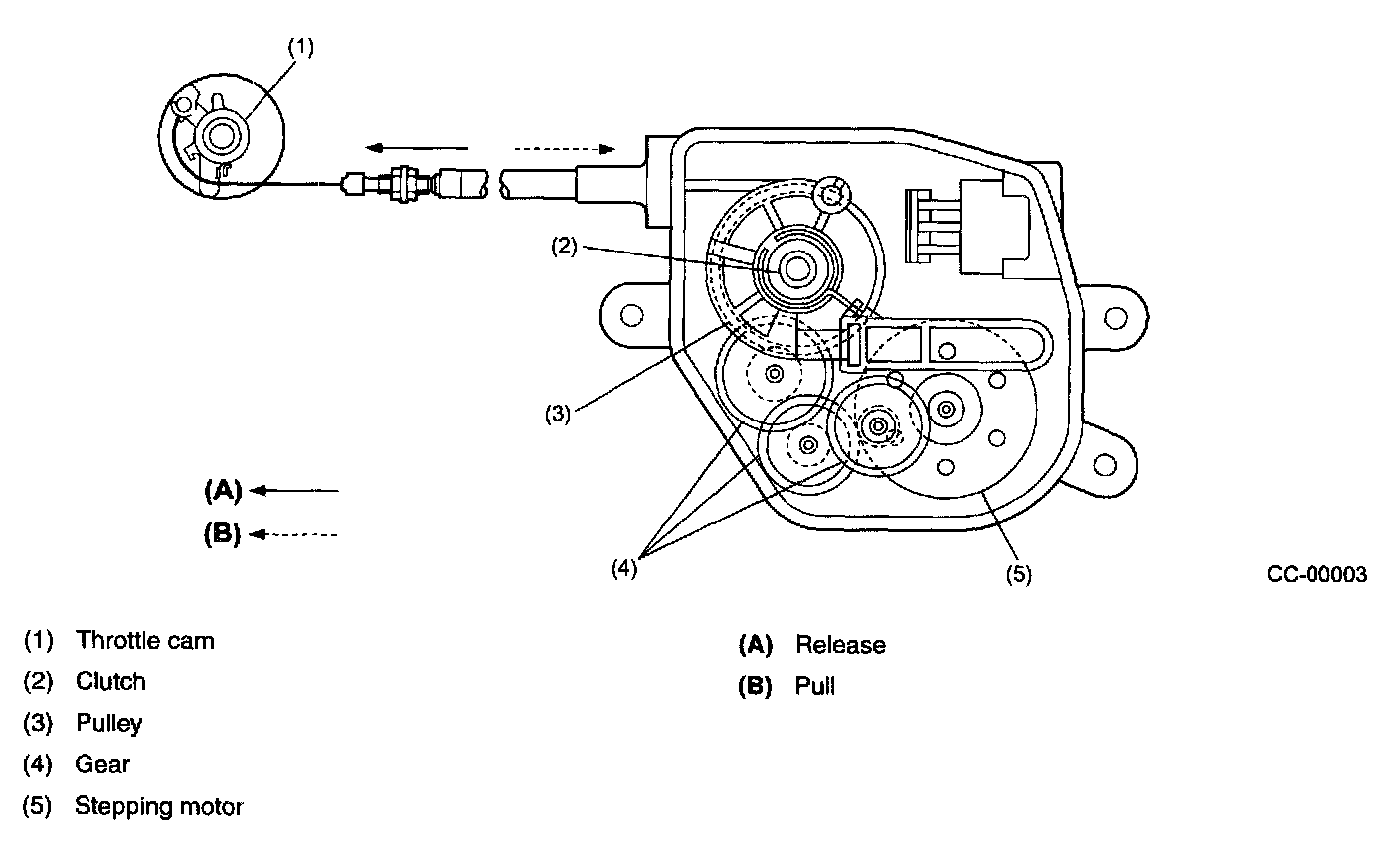 , the clutch in the actuator is turned ON. This causes the stepping motor to operate, pulling the throttle cam for speed control.