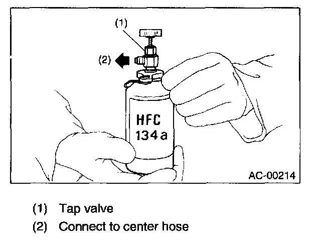 18. If the HFC-134a source is empty, close the low-pressure valve and then close the valve on can tap before replacing the empty source. Restart charging operation after replacing the HFC-134a source with a new one and purging.