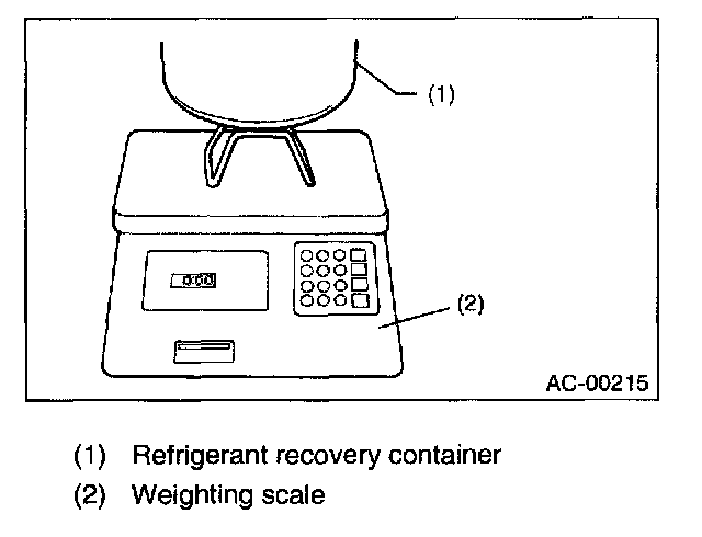 11. When a refrigerant recovery container is used, measure the refrigerant amount in use using a weighting scale before connecting to center hose.