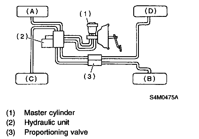 CAUTION: Brake fluid replacement sequence; (A) Front right - (B) Rear left - (C) Front left - (D) Rear right