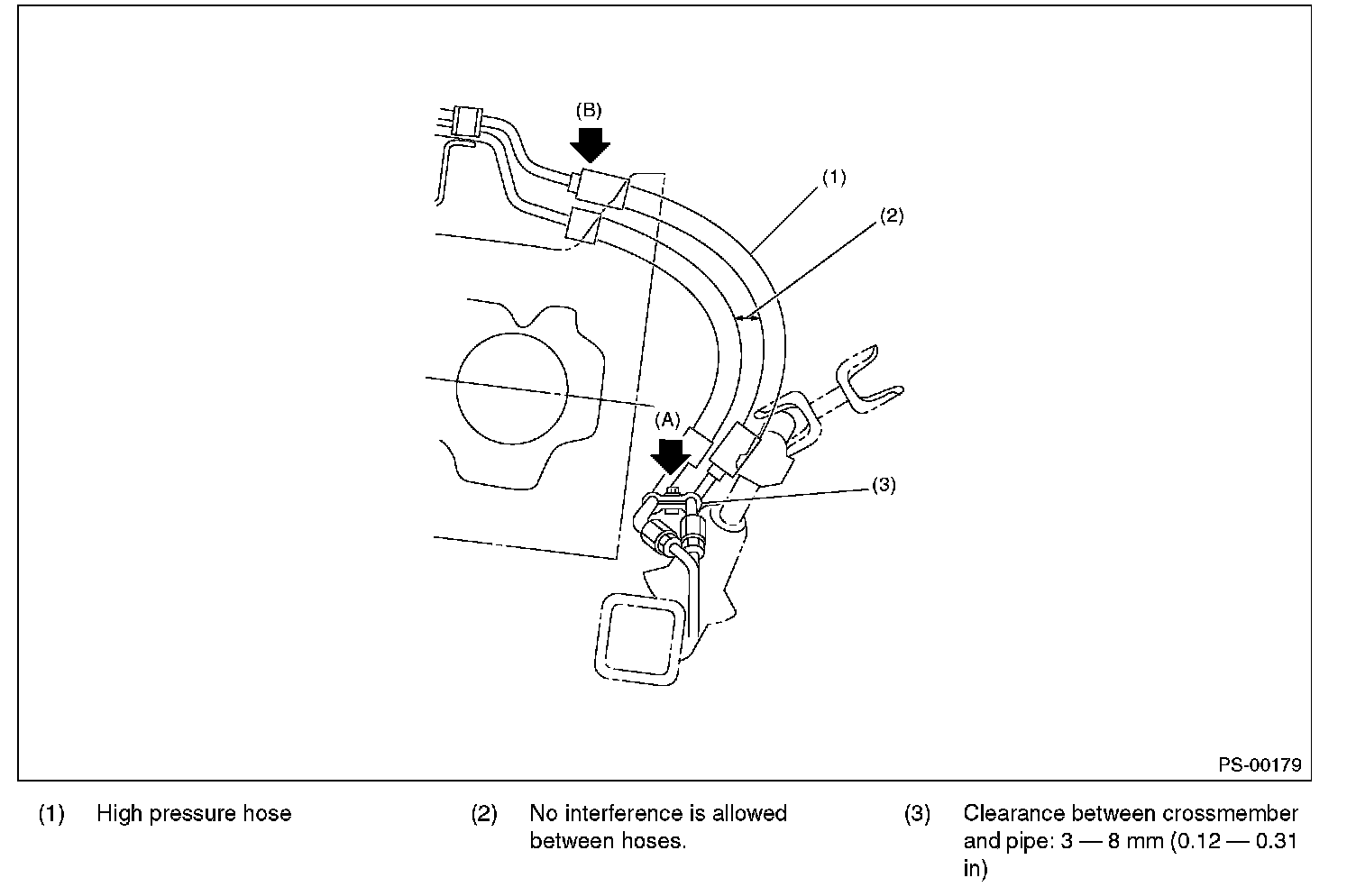 If cruise control actuator-to-power steering hose clearance is less than 10 mm (0.39 inch), move the portion (A) secured by clamp to other portion, or bend portion (B) to adjust.
