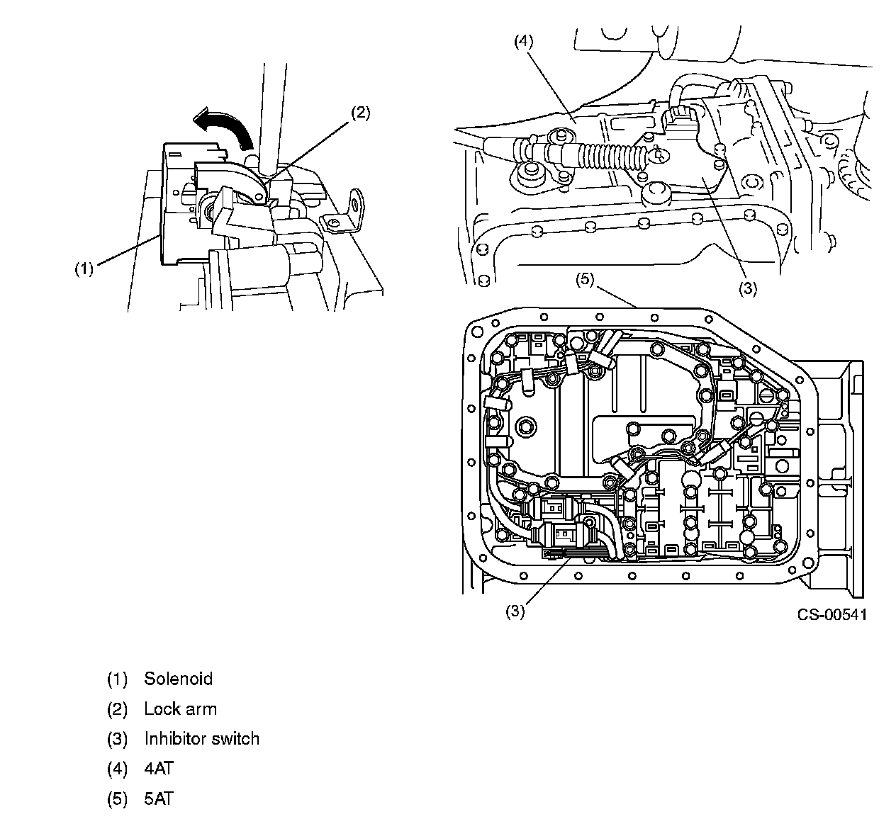 The shift lock system has a solenoid-operated plunger (1). With the select lever in the P position, the plunger remains extended, holding the lock arm (2) in its pushed out (locking) position. When the brake pedal is depressed with the ignition switch in either the ON or START position, the solenoid is energized and the plunger is retracted. This causes the lock arm to lift to the select lever release position. The select lever now can be moved to any other position. The P position of the select lever is detected by the inhibitor switch (3).
