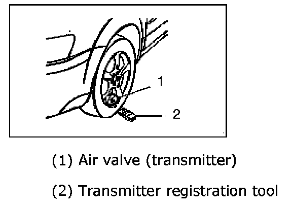 7. Touch the transmitter registration tool to the side wall area near the air valve on the front left tire, and press the switch. The transmitter ID is sent to the tire pressure monitoring control module. (At that time, the tire pressure warning light blinks to confirm that the registration has started.)