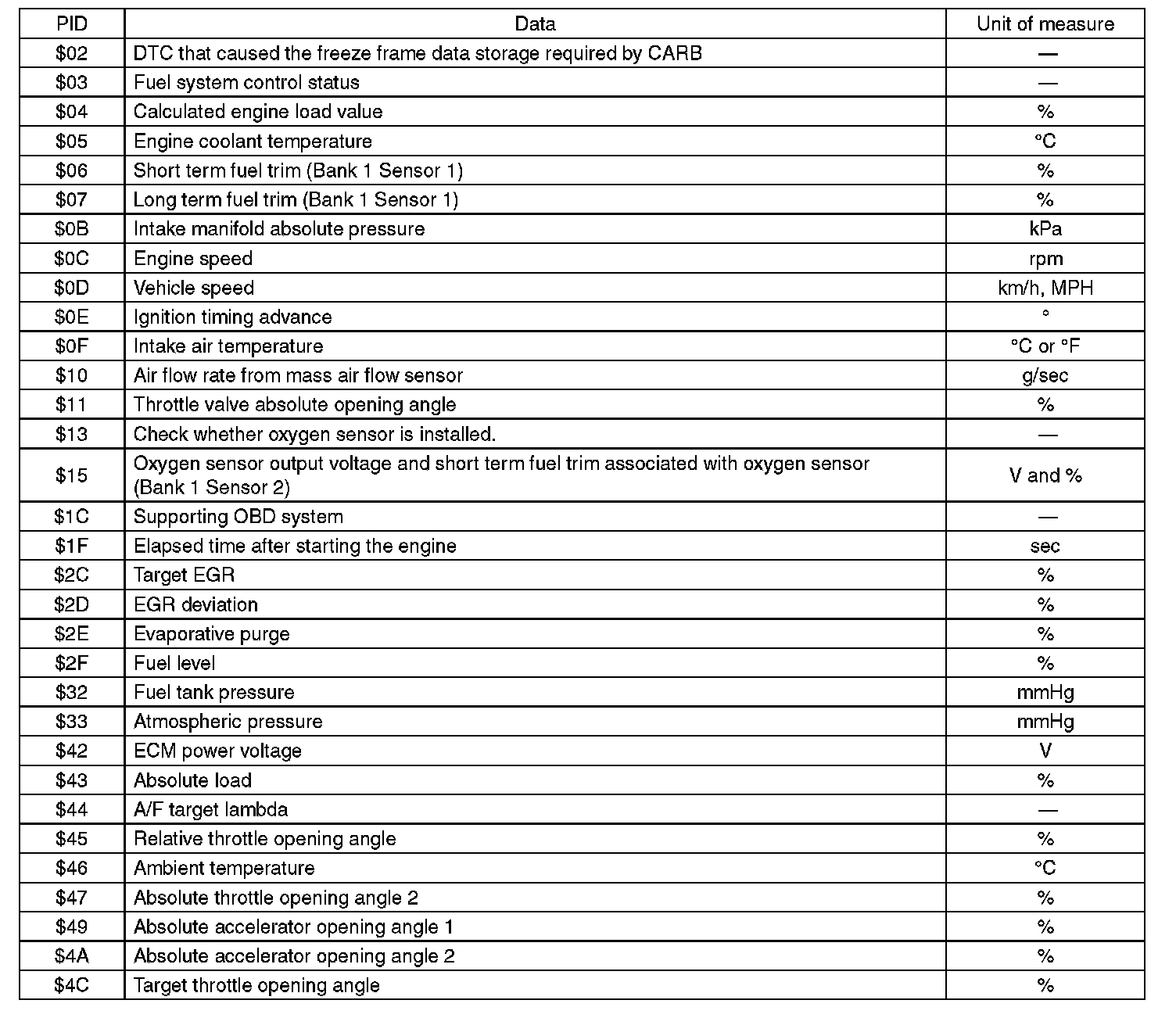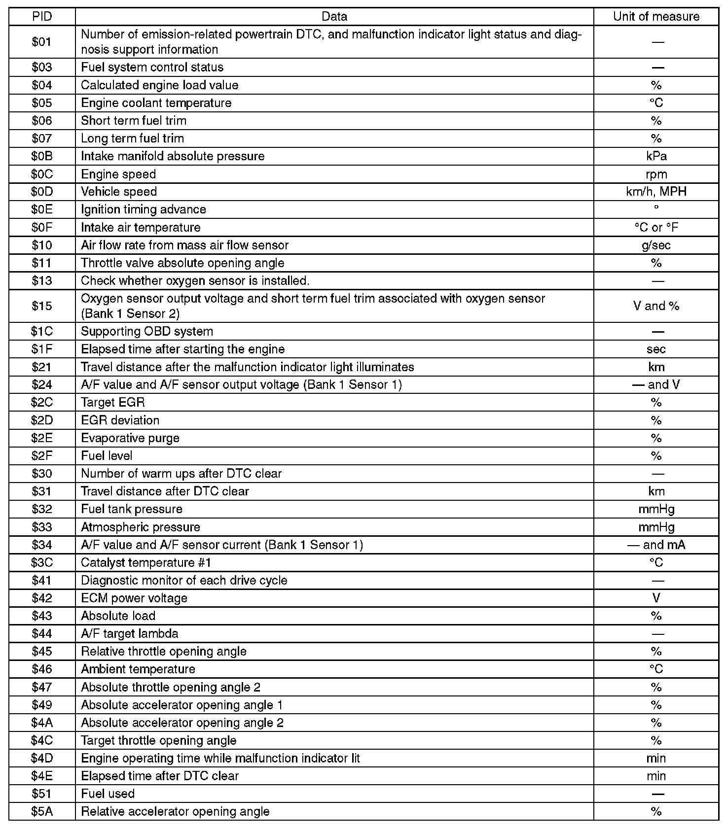 A list of the support data and PID (Parameter Identification) codes are shown in the table.