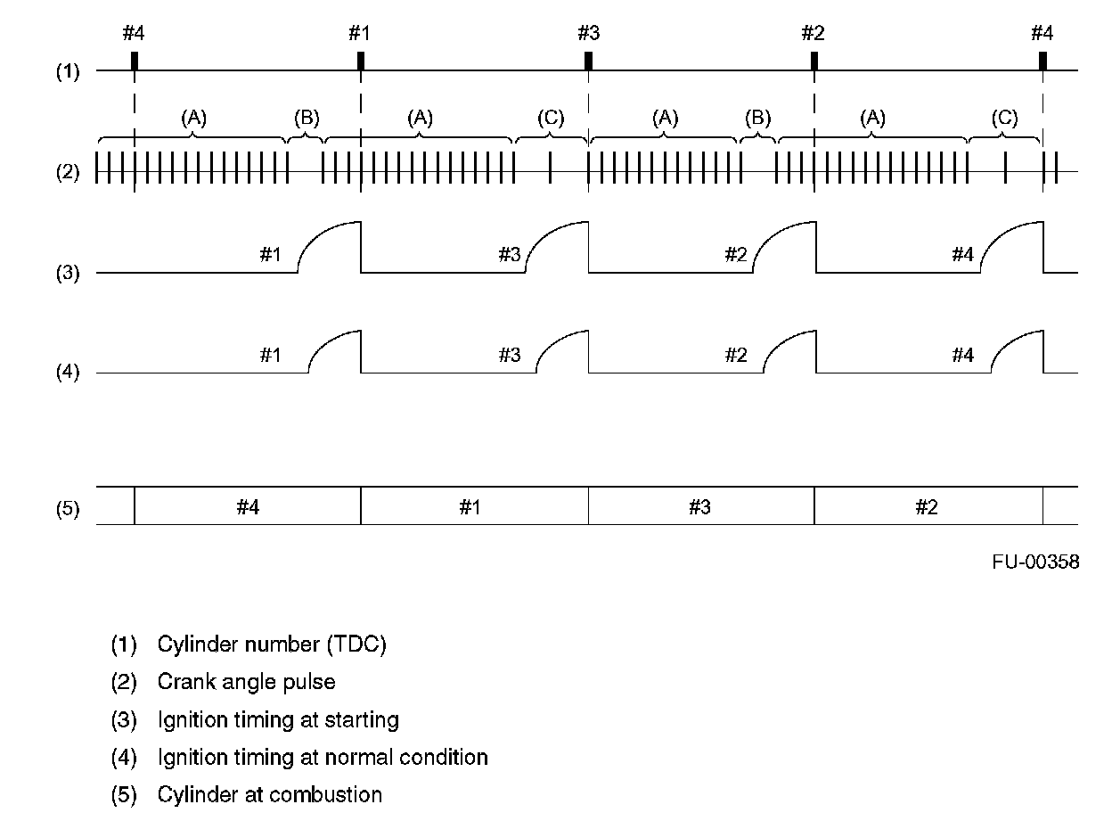 - The ECM judges that the No.1 and No.2 cylinders are at TDC when it detects the range (B), and that the No.3 and No.4 cylinders are at TDC when it detects the range (C).