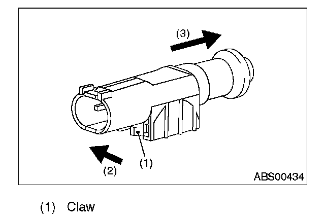 3. Separate the sensor connector and vehicle securing clip. Apply force in the direction of (2) to unlock the claw, and then slide the connector in the direction of (3). Pull out the connector to the tire side from grommet hole.