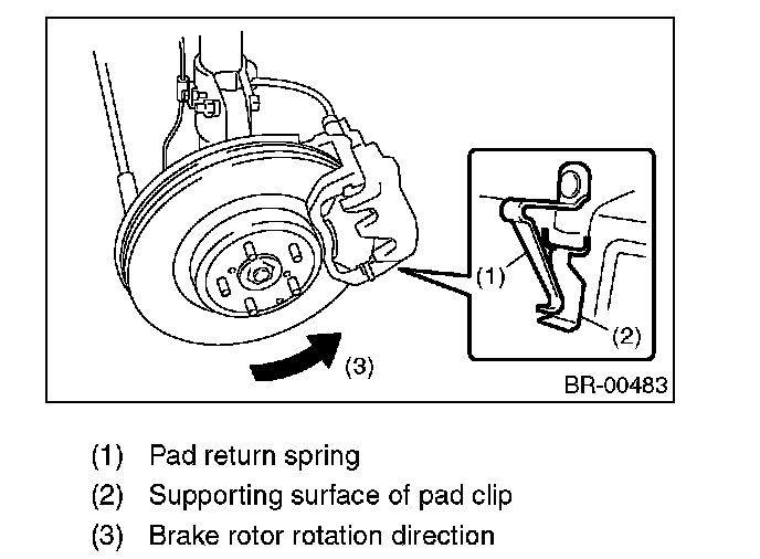 ^ Correctly install the pad return spring to supporting surface of pad clip as shown in the figure.