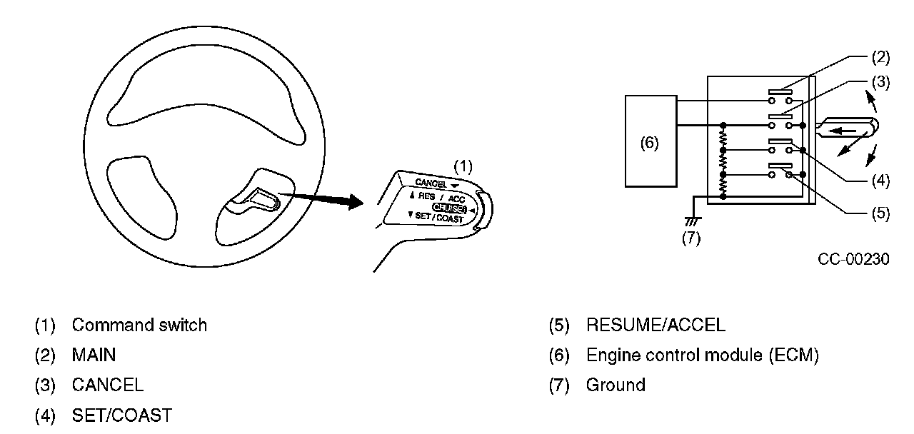 COMMAND SWITCH (CRUISE CONTROL LEVER)- When the vehicle is driven with the cruise control activated, the command switch controls its operation. It inputs MAIN signal, SET/COAST signal, RESUME/ ACCEL signal or CANCEL signal to the engine control module (ECM).
