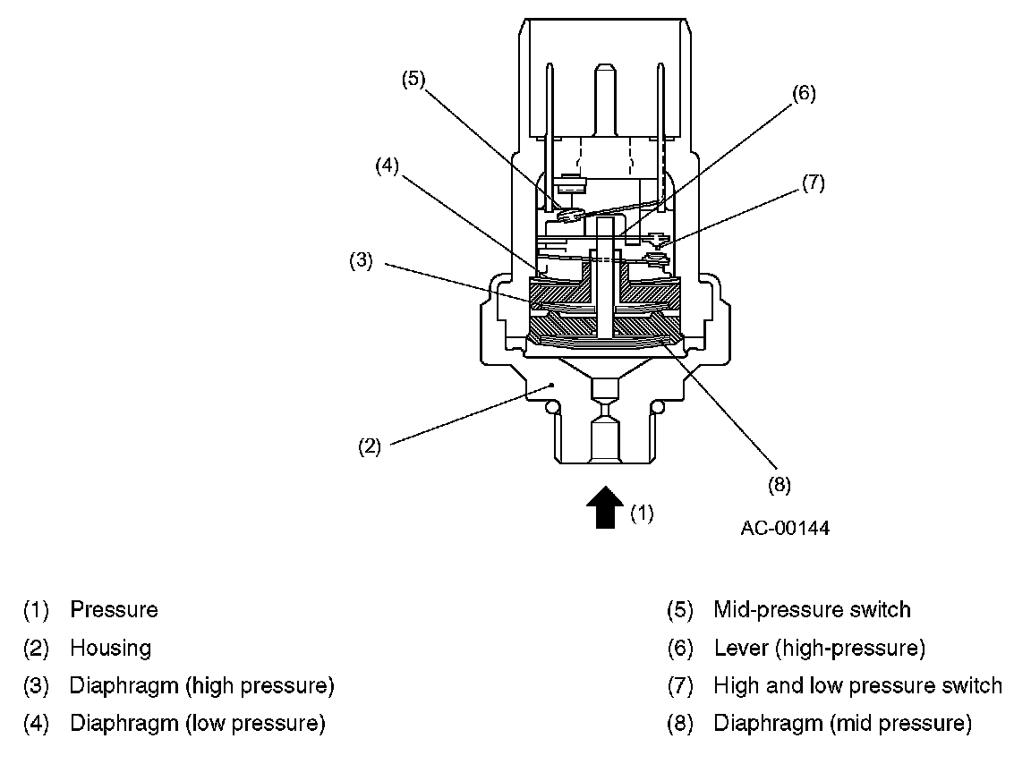 The pressure switch is a high-pressure side component of the refrigeration cycle (cooling cycle). It consists of a diaphragm that receives refrigerant gas pressure, a snap plate, a rod, contacts that open both when the gas pressure is too low and when it is too high, and a switch that operates at mid-pressure.