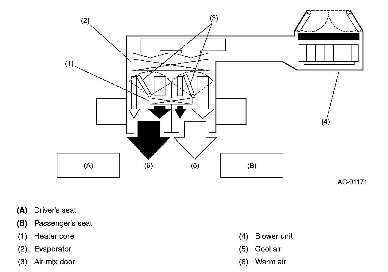 GENERAL- A semi-center type integrated air conditioning unit is used, where a high performance heater core and an evaporator core are placed in front and rear of the unit. While ensuring sufficient leg space at the front passenger's seat, resistance to air flow in the air passage is reduced, and the air conditioning system offers a low noise and comfortable environment in all seasons through its functions such as heating, air conditioning, ventilating and defrosting.