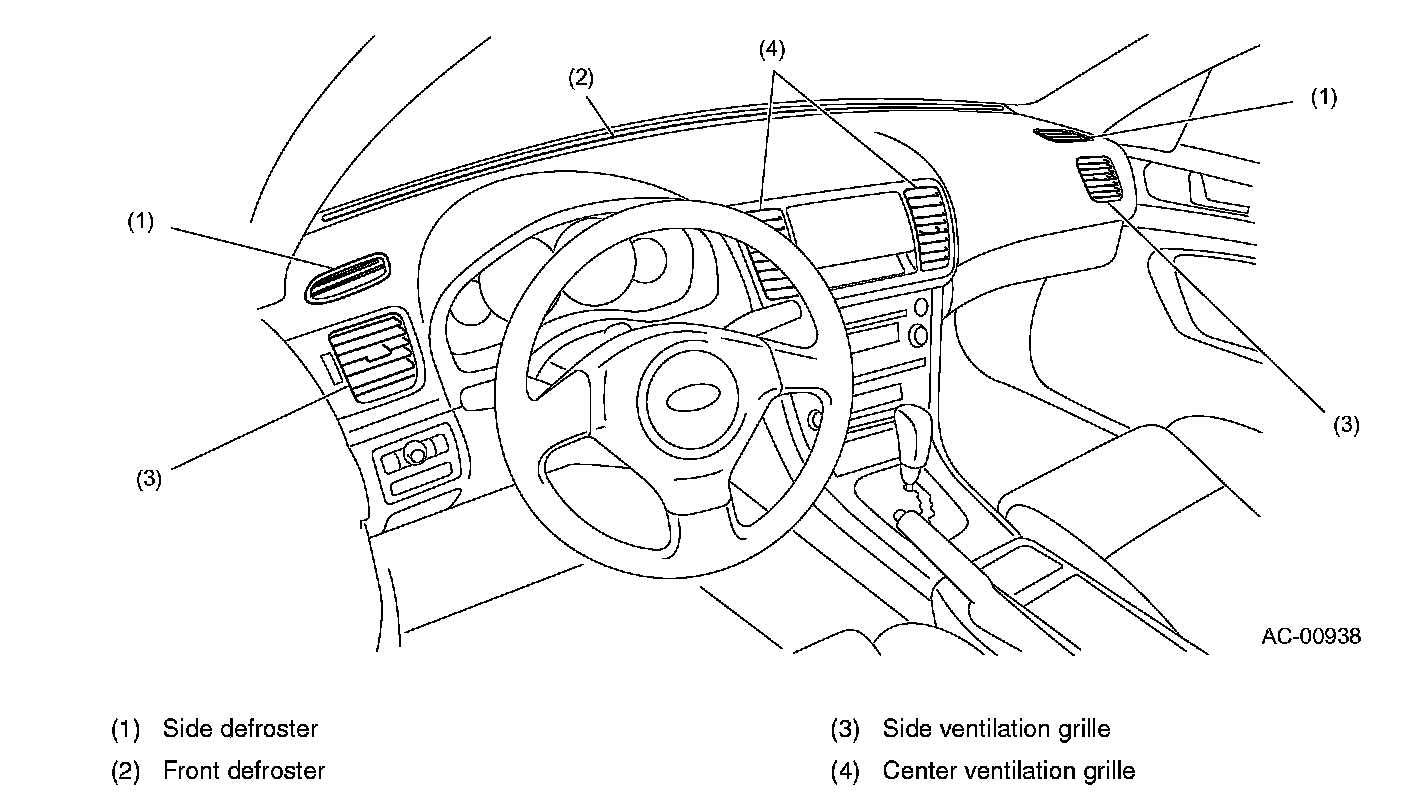 - There are four ventilation grilles in the dashboard; two large size grilles at the center and a side grille at each side. To improve the defrosting performance, air is always sent out from the side grilles.
