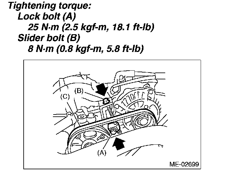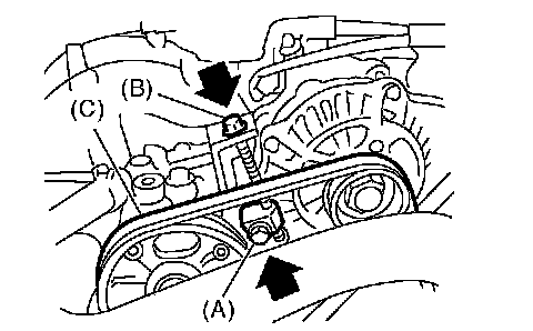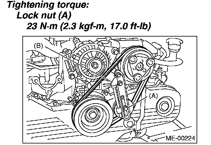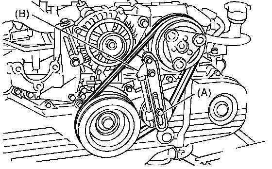2. Install a V belt, and tighten the slider bolt (B) so as to obtain the specified belt tension.