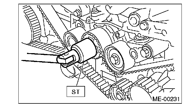 1. Use the ST to turn crankshaft. Align the mark (a) of sprocket to the cylinder block notch (b), and then ensure the right side cam sprocket mark (c), cam cap and cylinder head matching surface (d) or left side cam sprocket mark (e), timing belt cover notch (f) are properly adjusted.
