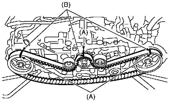 2. While aligning the alignment mark (B) on timing belt with the mark (A) on sprockets, position the timing belt properly.